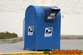 #2048 — A close up picture taken of a blue United States Postal Service (USPS) mailbox on the corner of a sidewalk.