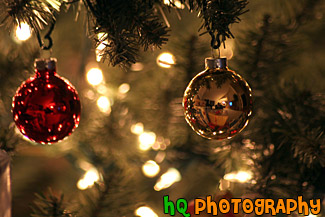 #1452 — A close up scenic picture taken of a Christmas ornaments on a Christmas tree during the holiday season. A red bell and blue ball are prominent in this picture of ornaments.