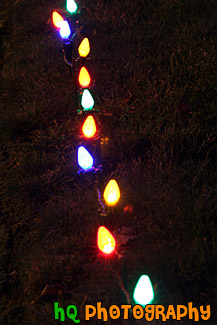 #879 — A scenic close up picture taken of some Christmas lights that border a homeowner's yard and the grass.