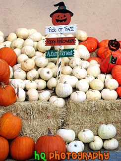 #232 — A picture of a bunch up of pumpkins with Halloween decorations. During this time of year grocery stores and other businesses place a lot of pumpkins out for sale to celebrate the upcoming holiday, Halloween. Halloween is a holiday in which kids dress up in costumes and go around their neighborhoods "trick or treating."