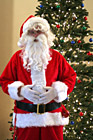 #848 — A close up picture taken of Santa Claus sitting in chair near the Christmas Tree. In this picture Santa has a long white beard and is wearing his red suite. Santa Claus is a cousin to Europe's legendary St. Nicolas whose feast day is Dec. 6. But while Nicholas is shown as a slender man in a long, hooded coat, Santa is a fat, jolly elf. His name likely comes from the Dutch version of St. Nicholas which they call Sinterklaas (which when said in the Dutch language sounds a lot like the words Santa Claus to those who speak the English language).