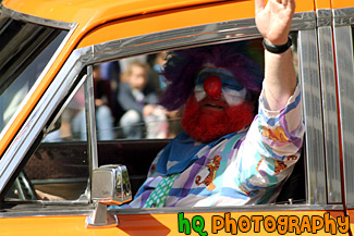 #1041 — A close up interesting picture taken of a clown in an orange clown car located at the annual Daffodil parade in downtown Tacoma, Washington.