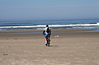 #1410 — A scenic vertical picture taken of a girl walking her dog along the beach at Santa Cruz, California.