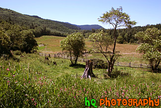 #804 — A scenic picture taken of a farmland located in Marin County, California near the coast. In this picture you can see the green grass of the field with some cows grazing the land on this sunny spring day.