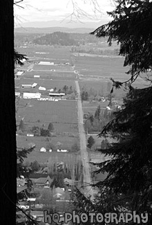 A scenic aerial picture view of the country land of Enumclaw, Washington looking down from Mt. Peak. You can see the countryside and farms while looking through some evergreen trees.