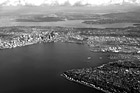 A scenic aerial picture taken of the Puget Sound area in Washington State. This picture was taken on an overcast, cloudy day.