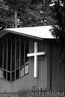 A scenic picture taken close up of a church building with a white cross located next to the large window. This church was surrounded by evergreen trees and is located in Washington State.