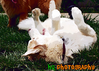 A funny picture of a Siberian Husky dog being silly rolling over on his back while playing with another dog. In this photo, the husky looks to be upside down while laying on its' back.