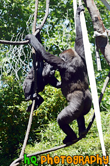 A picture taken of two gorilla's on a tree branch located at the Woodland Park Zoo in Seattle, Washington. Gorillas were first seen by western civilization was in the 5th century B.C. by a Roman explorer. There are three subspecies of gorillas living in different parts of Africa. The differences between them are very slight. There names are: Western Lowland Gorilla (gorilla gorilla), Eastern Lowland Gorilla (gorilla graueri), and Mountain Gorilla (gorilla berengei). The differences between mountain gorillas and lowland gorillas are slight and result mainly from adaptation to high altitudes. Mountain gorillas have longer body hair, higher foreheads, longer palates, larger nostrils, broader chests, shorter arms, shorter, wider hands and feet. Males grow up to 5'6" upright, 4'6" normal stance. Females grow up to 5' upright, 3'6" - 4' normal stance. Gorillas eat some 200 types of leaves, tubers, flowers, fruit, fungus and some insects. Favorite foods include bamboo, thistles and wild celery. Gorillas do not drink water. They obtain all the moisture they need from the vast amounts of foliage they consume. Males consume approximately 50 lbs. a day.