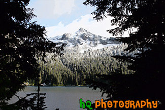 A scenic picture taken of snow covered Mother Mountains in the background of Mowich Lake located near the Caron River Entrance to Mt. Rainier National Park. Silhouettes of trees are seen in the foreground and blue sky is seen above.