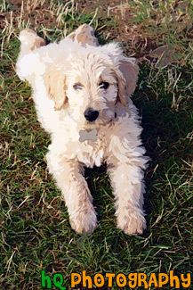 A cute close up photo taken of a apricot colored goldendoodle puppy at 10 weeks old laying on the grass with her hind legs sticking out while looking up at the camera.