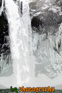 A scenic vertical photo taken close up of the spectacular Snoqualmie Falls located in Washington State. This photo was taken during the December freeze of 2009 where icicles formed all around the falls.