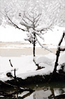 A scenic vertical picture taken of snow covered trees and snow covered water in the wilderness. The photo was taken in Mt. Rainier National Park near Longmire.