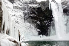 A scenic picture taken of a bunch of thick icicles that have formed along the rocks and wall located at Snoqualmie Falls in Washington State during the December 2009 winter freeze. Temperatures got as low as the teens during about a week of freezing weather.