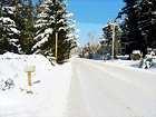 A beautiful winter scene picture taken when Washington state had a blast of cold weather and snow. This photo was taken in the foothills of the Cascade Mountains in Enumclaw, Washington. In this picture you can see a snow covered driveway with shadows from the sun shining over it. The trees surrounding the driveway are covered in snow.