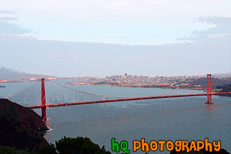 This is a scenic picture taken of the Golden Gate Bridge at the Presidio in San Francisco. It was taken just about as the sun was going to set as you can see from the changing colors in the sky. Today the Presidio is enjoyed by many people through the history and beauty it contains. Within the Presidio boundaries there are more than 500 historic buildings, a collection of coastal defense fortifications, a national cemetery, an historic airfield, a saltwater marsh, forests, beaches, native plant habitats, coastal bluffs, miles of hiking and biking, and some of the most spectacular vistas in the world... not to mention the spectacular views of the Golden Gate Bridge.