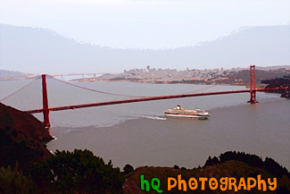This is a scenic picture taken of the Golden Gate Bridge at the Presidio in San Francisco. It was taken though some trees just as the sun was going to set as you can see from the changing colors in the sky. Today the Presidio is enjoyed by many people through the history and beauty it contains. Within the Presidio boundaries there are more than 500 historic buildings, a collection of coastal defense fortifications, a national cemetery, an historic airfield, a saltwater marsh, forests, beaches, native plant habitats, coastal bluffs, miles of hiking and biking, and some of the most spectacular vistas in the world... not to mention the spectacular views of the Golden Gate Bridge.